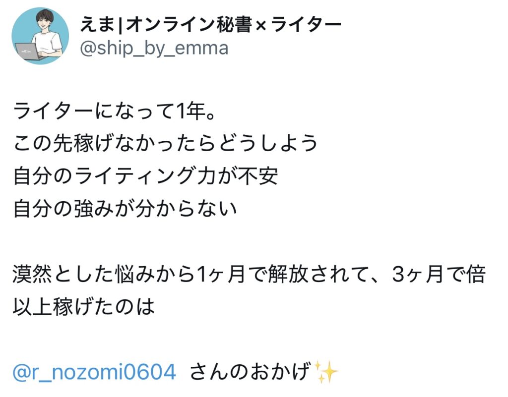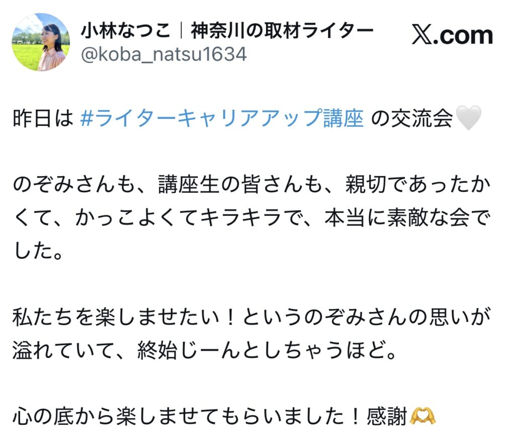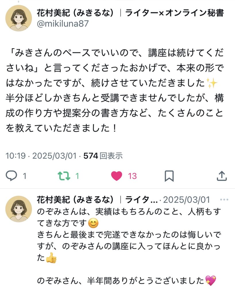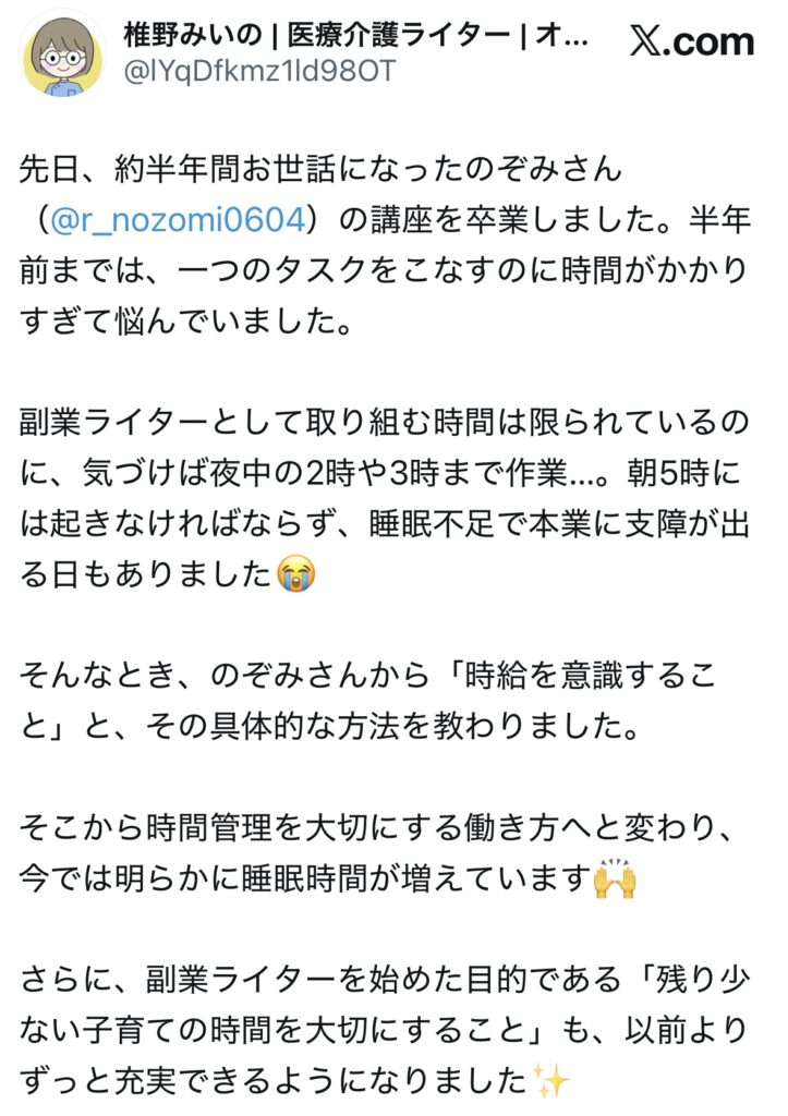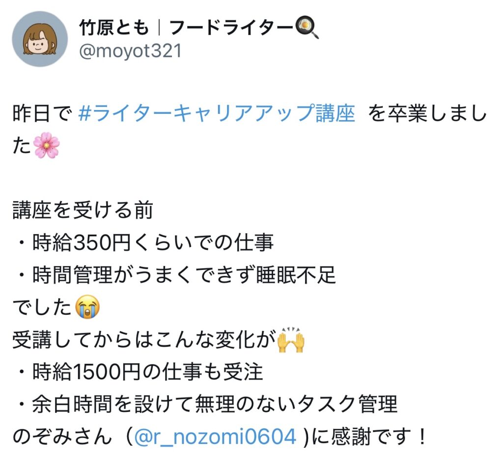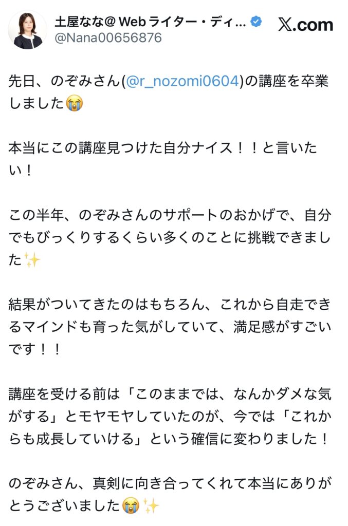 未分類 ライターキャリアアップ講座|生徒さんのお声 nozomi 2025年7月2日 2025.09.19 ライターキャリアアップ講座の生徒さんからのうれしいお声をいただいていますので、一部紹介いたします🌷 卒業生からのお声 生徒さんの成果 サポート内容 交流会、作業会 この4つに口コミを分けています!気になるところからご確認ください😌✨ 卒業生からのお声 生徒さんの成果 サポート内容 交流会・作業会